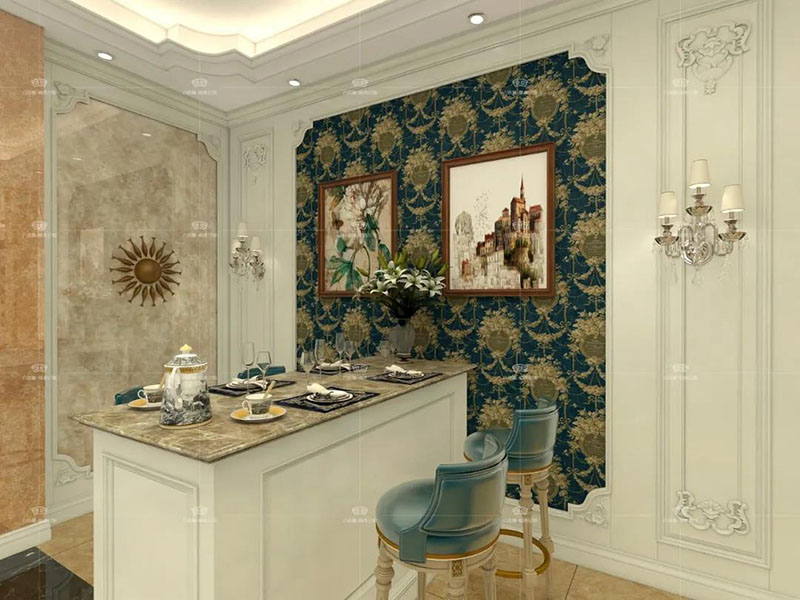 廚房分成了就餐區與制作區,就餐區使用了白色背景墻,搭配深色硬包,這樣吃飯的氛圍更加溫馨;廚房制作區因為空間足夠大, 同樣設計了多根羅馬柱,這樣使得廚房也有皇家范兒。