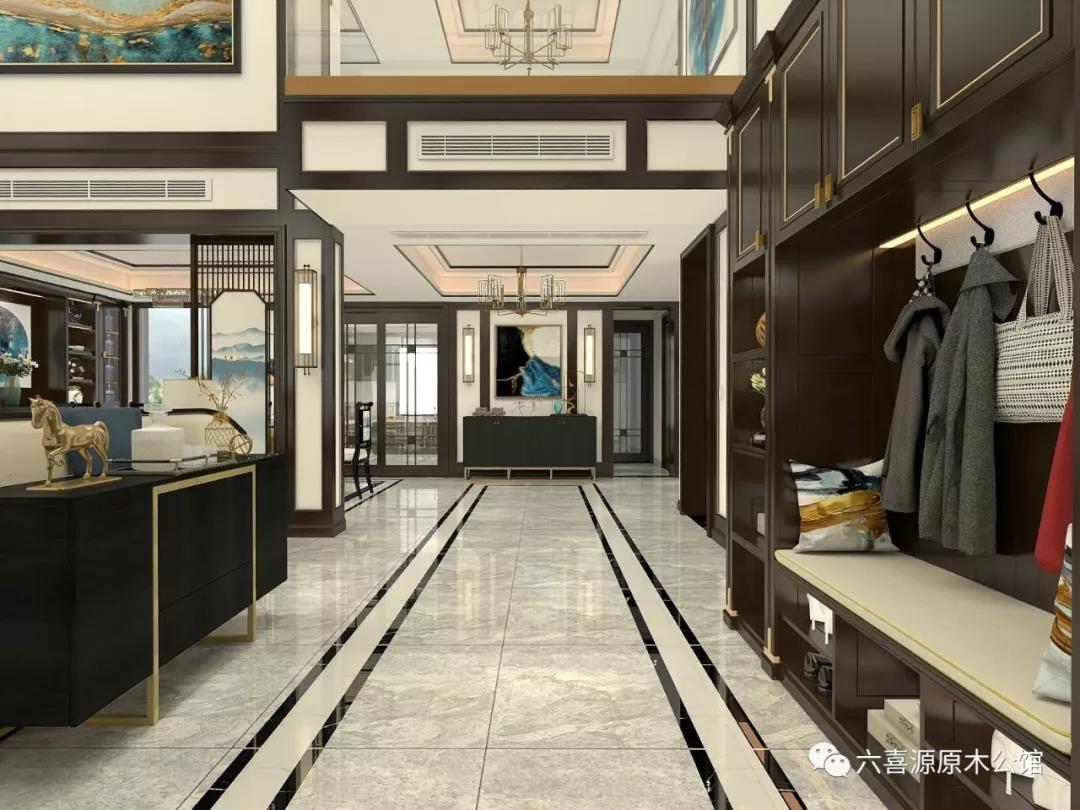 在別墅里,因為人口一般較多,所以在入戶里做了空間收納較強的入戶柜,整體開放結合,中間的榻榻米還可以坐下來換鞋,方便實用。