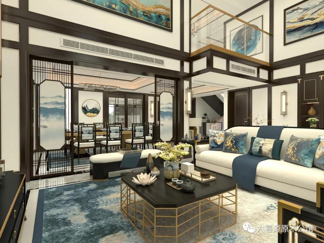 整體挑高設計,“黑胡桃色+淡金色”搭配,沉靜與活力互相輝映,加上暖色強光,讓客廳更加大方溫馨。